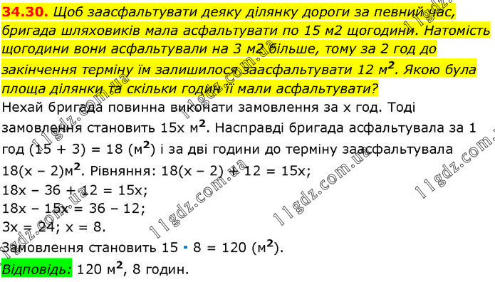 Щоб заасфальтувати деяку ділянку дороги за певний час, бригада шляховиків мала асфальтувати по 15 м2 щогодини. Натомість щогодини вони асфальтували на 3 м2 більше, тому за 2 год до закінчення терміну їм залишилося заасфальтувати 12 м2. Якою була площа ділянки та скільки годин її мали асфальтувати? Нехай бригада повинна виконати замовлення за х год. Тоді замовлення становить 15х м2. Насправді бригада асфальтувала за 1 год (15 + 3) = 18 (м2) і за дві години до терміну заасфальтувала 18(х – 2)м2. Рівняння: 18(х – 2) + 12 = 15х; 18х – 36 + 12 = 15х; 18x – 15х = 36 – 12; 3х = 24; х = 8. Замовлення становить 15 ∙ 8 = 120 (м2). Відповідь: 120 м2, 8 годин.