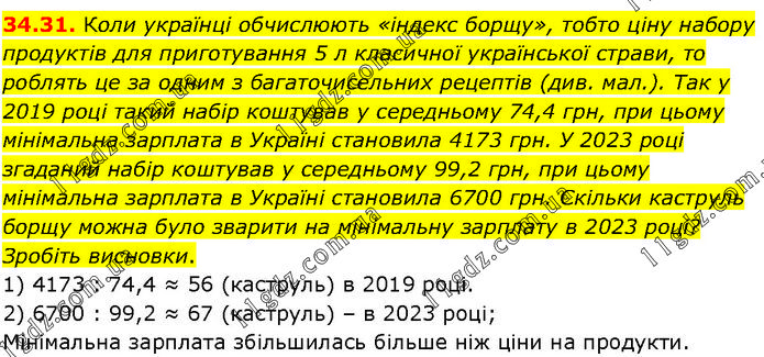 Коли українці обчислюють «індекс борщу», тобто ціну набору продуктів для приготування 5 л класичної української страви, то роблять це за одним з багаточисельних рецептів (див. мал.). Так у 2019 році такий набір коштував у середньому 74,4 грн, при цьому мінімальна зарплата в Україні становила 4173 грн. У 2023 році згаданий набір коштував у середньому 99,2 грн, при цьому мінімальна зарплата в Україні становила 6700 грн. Скільки каструль борщу можна було зварити на мінімальну зарплату в 2023 році? Зробіть висновки. 1) 4173 : 74,4 ≈ 56 (каструль) в 2019 році. 2) 6700 : 99,2 ≈ 67 (каструль) – в 2023 році; Мінімальна зарплата збільшилась більше ніж ціни на продукти.