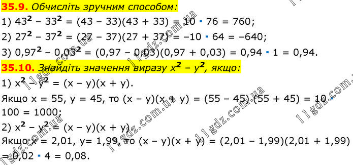 35.9. Обчисліть зручним способом: 1) 432 – 332 = (43 – 33)(43 + 33) = 10 ∙ 76 = 760; 2) 272 – 372 = (27 – 37)(27 + 37) = –10 ∙ 64 = –640; 3) 0,972 – 0,032 = (0,97 – 0,03)(0,97 + 0,03) = 0,94 ∙ 1 = 0,94. 35.10. Знайдіть значення виразу x2 – у2, якщо: 1) х2 – у2 = (х – у)(х + у). Якщо х = 55, у = 45, то (х – у)(х + у) = (55 – 45) (55 + 45) = 10 ∙ 100 = 1000; 2) x2 – у2 = (х – у)(х + у). Якщо х = 2,01, у= 1,99, то (х – у)(х + у) = (2,01 – 1,99)(2,01 + 1,99) = 0,02 ∙ 4 = 0,08.