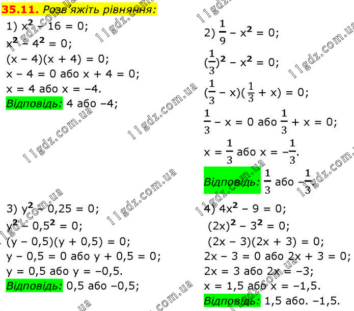 Розв’яжіть рівняння: 1) x2 – 16 = 0; x2 – 42 = 0; (x – 4)(x + 4) = 0; x – 4 = 0 або x + 4 = 0; x = 4 або x = –4. Відповідь: 4 або –4; 2) 1/9 – x2 = 0; (1/3)2 – x2 = 0; (1/3 – x)( 1/3 + x) = 0; 1/3 – x = 0 або 1/3 + х = 0; х = 1/3 або х = –1/3. Відповідь: 1/3 або –1/3. 3) y2 – 0,25 = 0; у2 – 0,52 = 0; (у – 0,5)(y + 0,5) = 0; у – 0,5 = 0 або у + 0,5 = 0; у = 0,5 або у = –0,5. Відповідь: 0,5 або –0,5; 4) 4х2 – 9 = 0; (2х)2 – 32 = 0; (2х – 3)(2х + 3) = 0; 2х – 3 = 0 або 2х + 3 = 0; 2х = 3 або 2х = –3; х = 1,5 або х = –1,5. Відповідь: 1,5 або. –1,5.