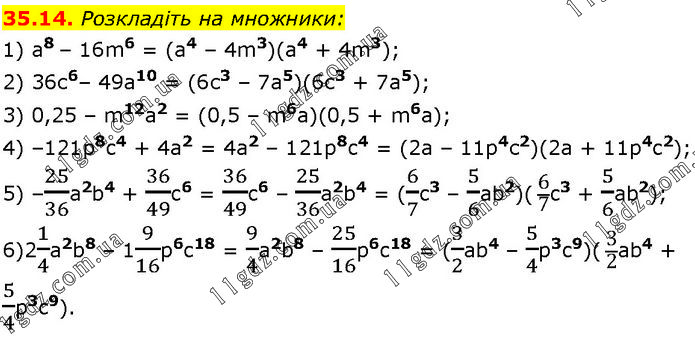 Розкладіть на множники: 1) a8 – 16m6 = (a4 – 4m3)(а4 + 4m3); 2) 36с6– 49a10 = (6с3 – 7a5)(6с3 + 7a5); 3) 0,25 – m12a2 = (0,5 – m6a)(0,5 + m6а); 4) –121p8c4 + 4а2 = 4a2 – 121p8c4 = (2a – 11p4с2)(2a + 11p4c2); 5) –25/36a2b4 + 36/49c6 = 36/49c6 – 25/36a2b4 = (6/7c3 – 5/6ab2)( 6/7c3 + 5/6ab2); 6) 21/4a2b8 – 19/16p6c18 = 9/4a2b8 – 25/16p6c18 = (3/2ab4 – 5/4p3c9)( 3/2ab4 + 5/4p3c9).