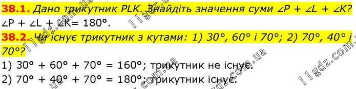 38.1. Дано трикутник PLK. Знайдіть значення суми ∠P + ∠L + ∠K? ∠P + ∠L + ∠K= 180°. 38.2. Чи існує трикутник з кутами: 1) 30°, 60° і 70°; 2) 70°, 40° і 70°? 1) 30° + 60° + 70° = 160°; трикутник не існує. 2) 70° + 40° + 70° = 180°; трикутник існує.