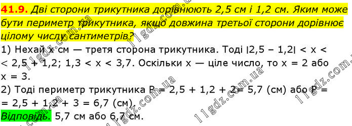 Дві сторони трикутника дорівнюють 2,5 см і 1,2 см. Яким може бути периметр трикутника, якщо довжина третьої сторони дорівнює цілому числу сантиметрів? 1) Нехай х см — третя сторона трикутника. Тоді ∣2,5 – 1,2∣ < х < 2,5 + 1,2; 1,3 < х < 3,7. Оскільки х — ціле число, то х = 2 або х = 3. 2) Тоді периметр трикутника P = 2,5 + 1,2 + 2= 5,7 (см) або P = 2,5 + 1,2 + 3 = 6,7 (см). Відповідь. 5,7 см або 6,7 см.