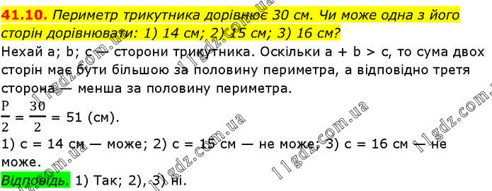 Периметр трикутника дорівнює 30 см. Чи може одна з його сторін дорівнювати: 1) 14 см; 2) 15 см; 3) 16 см? Нехай а; b; с — сторони трикутника. Оскільки a + b > с, то сума двох сторін має бути більшою за половину периметра, а відповідно третя сторона — менша за половину периметра. Р/2 = 30/2 = 51 (см). 1) с = 14 см — може; 2) с = 15 см — не може; 3) с = 16 см — не може. Відповідь. 1) Так; 2), 3) ні.