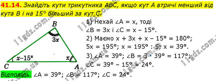 Знайдіть кути трикутника ABC, якщо кут А втричі менший від кута В і на 15° більший за кут С. 1) Нехай ∠A = х, тоді ∠B = Зх і ∠C = х – 15°. 2) Маємо х + Зх + х – 15° = 180°; 5х = 195°; х = 195° : 5; х = 39°. 3) ∠A = 39°; ∠B = 3 ∙ 39° = 117°; ∠C = 39° – 15° = 24°. Відповідь. ∠A = 39°; ∠B = 117°; ∠C = 24°.