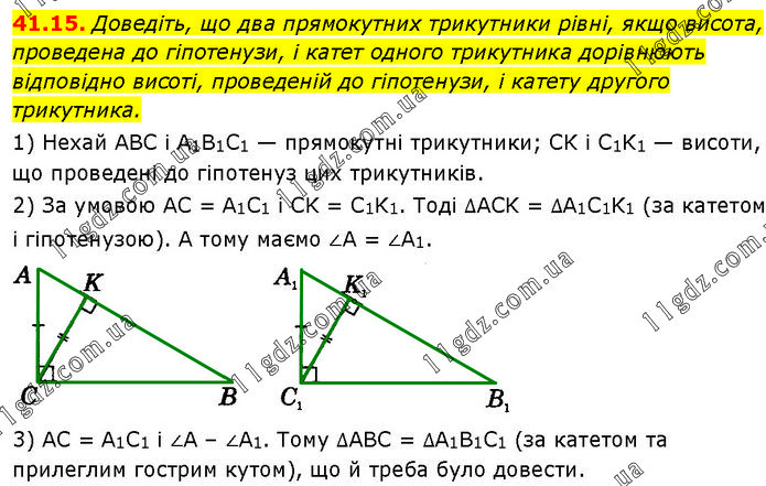 Доведіть, що два прямокутних трикутники рівні, якщо висота, проведена до гіпотенузи, і катет одного трикутника дорівнюють відповідно висоті, проведеній до гіпотенузи, і катету другого трикутника. 1) Нехай ABC і A1B1C1 — прямокутні трикутники; CK і C1K1 — висоти, що проведені до гіпотенуз цих трикутників. 2) За умовою AC = A1C1 і CK = C1K1. Тоді ∆ACK = ∆A1C1K1 (за катетом і гіпотенузою). А тому маємо ∠A = ∠A1. 3) AC = A1C1 і ∠A – ∠A1. Тому ∆ABC = ∆A1B1C1 (за катетом та прилеглим гострим кутом), що й треба було довести.