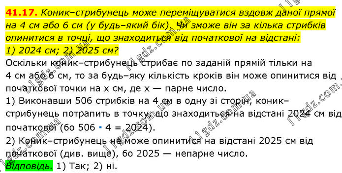 Коник–стрибунець може переміщуватися вздовж даної прямої на 4 см або 6 см (у будь–який бік). Чи зможе він за кілька стрибків опинитися в точці, що знаходиться від початкової на відстані: 1) 2024 см; 2) 2025 см? Оскільки коник–стрибунець стрибає по заданій прямій тільки на 4 см або 6 см, то за будь–яку кількість кроків він може опинитися від початкової точки на х см, де х — парне число. 1) Виконавши 506 стрибків на 4 см в одну зі сторін, коник–стрибунець потрапить в точку, що знаходиться на відстані 2024 см від початкової (бо 506 ∙ 4 = 2024). 2) Коник–стрибунець не може опинитися на відстані 2025 см від початкової (див. вище), бо 2025 — непарне число. Відповідь. 1) Так; 2) ні.