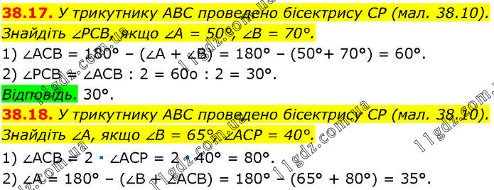 38.17. У трикутнику ABC проведено бісектрису CP (мал. 38.10). Знайдіть ∠PCB, якщо ∠A = 50°, ∠B = 70°. 1) ∠ACB = 180° – (∠A + ∠B) = 180° – (50°+ 70°) = 60°. 2) ∠PCB = ∠ACB : 2 = 60o : 2 = 30°. Відповідь. 30°. 38.18. У трикутнику ABC проведено бісектрису CP (мал. 38.10). Знайдіть ∠А, якщо ∠B = 65°, ∠ACP = 40°. 1) ∠ACB = 2 ∙ ∠ACP = 2 ∙ 40° = 80°. 2) ∠A = 180° – (∠B + ∠ACB) = 180° – (65° + 80°) = 35°.
