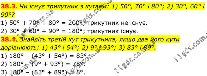 38.3. Чи існує трикутник з кутами: 1) 50°, 70° і 80°; 2) 30°, 60° і 90°? 1) 50° + 70° + 80° = 200°; трикутник не існує. 2) 30° + 60° + 90° = 180°; трикутник існує. 38.4. Знайдіть третій кут трикутника, якщо два його кути дорівнюють: 1) 43° і 54°; 2) 9° і 93°; 3) 83° і 89°. 1) 180° – (43° + 54°) = 83°. 2) 180° – (9° + 93°) = 78°. 3) 180° – (83° + 89°) = 8°.