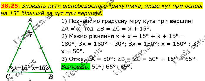 Знайдіть кути рівнобедреного трикутника, якщо кут при основі на 15° більший за кут при вершині. 1) Позначимо градусну міру кута при вершині ∠A = х, тоді ∠B = ∠C = х + 15°. 2) Маємо рівняння х + х + 15° + х + 15° = 180°; Зх = 180° – 30°; Зх = 150°; х = 150° : 3; х = 50°. 3) Отже, ∠A = 50°; ∠B = ∠C = 50° + 15° = 65°. Відповідь. 50°; 65°; 65°.