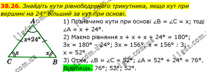 Знайдіть кути рівнобедреного трикутника, якщо кут при вершині на 24° більший за кут при основі. 1) Позначимо кути при основі ∠B = ∠C = х; тоді ∠A = х + 24°. 2) Маємо рівняння х + х + х + 24° = 180°; Зх = 180° – 24°; Зх = 156°; х = 156° : 3; х = 52°. 3) Отже, ∠B = ∠C = 52°; ∠A = 52° + 24° = 76°. Відповідь. 76°; 52°; 52°.