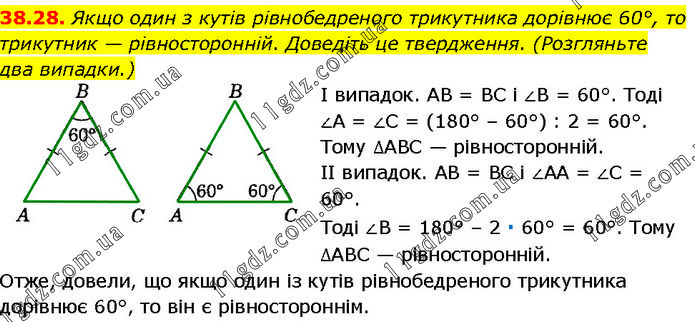 Якщо один з кутів рівнобедреного трикутника дорівнює 60°, то трикутник — рівносторонній. Доведіть це твердження. (Розгляньте два випадки.) І випадок. AB = BC і ∠B = 60°. Тоді ∠A = ∠C = (180° – 60°) : 2 = 60°. Тому ∆ABC — рівносторонній. ІІ випадок. AB = BC і ∠AA = ∠C = 60°. Тоді ∠B = 180° – 2 ∙ 60° = 60°. Тому ∆ABC — рівносторонній. Отже, довели, що якщо один із кутів рівнобедреного трикутника дорівнює 60°, то він є рівностороннім.