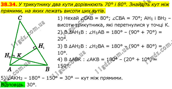 У трикутнику два кути дорівнюють 70° і 80°. Знайдіть кут між прямими, на яких лежать висоти цих кутів. 1) Нехай ∠CAB = 80°; ∠CBA = 70°; AH1 і BH2 – висоти трикутника, які перетнулися у точці К. 2) В ∆AH1B : ∠H1AB = 180° – (90° + 70°) = 20°. 3) В ∆AH2B : ∠H2BA = 180° – (90° + 80°) = 10°. 4) В ∆ABK : ∠AKB = 180° – (20° + 10°) = 150°. 5) ∠AKH2 – 180° – 150° = 30° — кут між прямими. Відповідь. 30°.