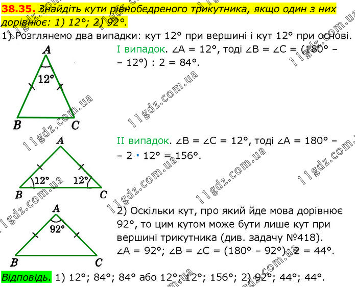 Знайдіть кути рівнобедреного трикутника, якщо один з них дорівнює: 1) 12°; 2) 92°. 1) Розглянемо два випадки: кут 12° при вершині і кут 12° при основі. І випадок. ∠A = 12°, тоді ∠B = ∠C = (180° – 12°) : 2 = 84°. II випадок. ∠B = ∠C = 12°, тоді ∠A = 180° – 2 ∙ 12° = 156°. 2) Оскільки кут, про який йде мова дорівнює 92°, то цим кутом може бути лише кут при вершині трикутника (див. задачу №38.27). ∠A = 92°; ∠B = ∠C = (180° – 92°) : 2 = 44°. Відповідь. 1) 12°; 84°; 84° або 12°; 12°; 156°; 2) 92°; 44°; 44°.
