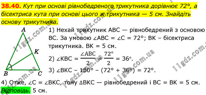 Кут при основі рівнобедреного трикутника дорівнює 72°, а бісектриса кута при основі цього ж трикутника — 5 см. Знайдіть основу трикутника. 1) Нехай трикутник ABC — рівнобедрений з основою BC. За умовою ∠ABC = ∠C = 72°; BK – бісектриса трикутника. BK = 5 см. 2) ∠КВС = (∠АВС)/2 = (72°)/2 = 36°. 3) ∠ВКС – 180° – (72° + 36°) = 72°. 4) Отже, ∠C = ∠BKC, тому ∆BKC — рівнобедрений і BC = BK = 5 см. Відповідь. 5 см.