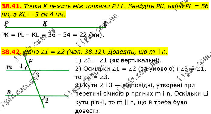 38.41. Точка K лежить між точками P і L. Знайдіть PK, якщо PL = 56 мм, a KL = 3 см 4 мм. PK = PL – KL = 56 – 34 = 22 (мм). 38.42. Дано ∠1 = ∠2 (мал. 38.12). Доведіть, що m ∥ n. 1) ∠3 = ∠1 (як вертикальні). 2) Оскільки ∠1 = ∠2 (за умовою) і ∠3 = ∠1, то ∠2 = ∠3. 3) Кути 2 і 3 — відповідні, утворені при перетині січною р прямих m і n. Оскільки ці кути рівні, то m ∥ n, що й треба було довести.