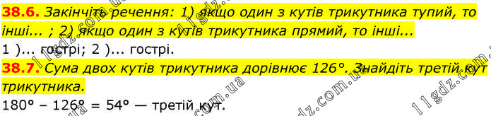 38.6. Закінчіть речення: 1) якщо один з кутів трикутника тупий, то інші... ; 2) якщо один з кутів трикутника прямий, то інші... 1) ... гострі; 2) ... гострі. 38.7. Сума двох кутів трикутника дорівнює 126°. Знайдіть третій кут трикутника. 180° – 126° = 54° — третій кут.
