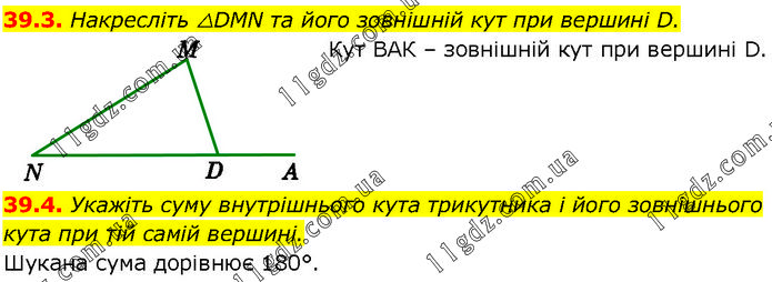 39.3. Накресліть △DMN та його зовнішній кут при вершині D. Кут ВАК – зовнішній кут при вершині D. 39.4. Укажіть суму внутрішнього кута трикутника і його зовнішнього кута при тій самій вершині. Шукана сума дорівнює 180°.