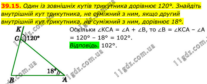 Один із зовнішніх кутів трикутника дорівнює 120°. Знайдіть внутрішній кут трикутника, не суміжний з ним, якщо другий внутрішній кут трикутника, не суміжний з ним, дорівнює 18°. Оскільки ∠КCA = ∠A + ∠B, то ∠B = ∠KCA – ∠A = 120° – 18° = 102°. Відповідь. 102°.