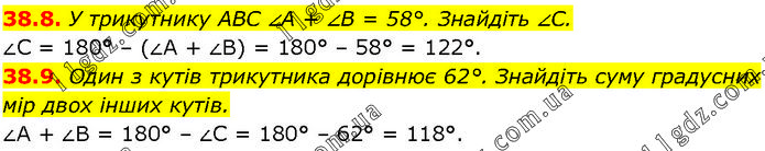 38.8. У трикутнику ABC ∠A + ∠B = 58°. Знайдіть ∠С. ∠C = 180° – (∠A + ∠B) = 180° – 58° = 122°. 38.9. Один з кутів трикутника дорівнює 62°. Знайдіть суму градусних мір двох інших кутів. ∠A + ∠B = 180° – ∠C = 180° – 62° = 118°.