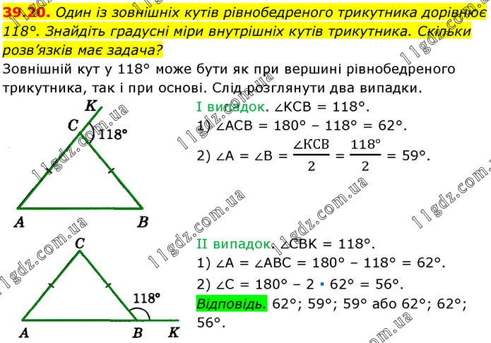 Один із зовнішніх кутів рівнобедреного трикутника дорівнює 118°. Знайдіть градусні міри внутрішніх кутів трикутника. Скільки розв’язків має задача? Зовнішній кут у 118° може бути як при вершині рівнобедреного трикутника, так і при основі. Слід розглянути два випадки. І випадок. ∠KCB = 118°. 1) ∠ACB = 180° – 118° = 62°. 2) ∠A = ∠B = (∠КСВ)/2 = (118°)/2 = 59°. II випадок. ∠CBK = 118°. 1) ∠A = ∠ABC = 180° – 118° = 62°. 2) ∠C = 180° – 2 ∙ 62° = 56°. Відповідь. 62°; 59°; 59° або 62°; 62°; 56°.
