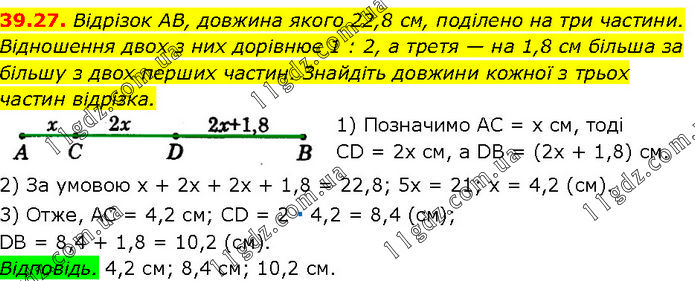 Відрізок AB, довжина якого 22,8 см, поділено на три частини. Відношення двох з них дорівнює 1 : 2, а третя — на 1,8 см більша за більшу з двох перших частин. Знайдіть довжини кожної з трьох частин відрізка. 1) Позначимо AC = х см, тоді CD = 2x см, a DB = (2х + 1,8) см. 2) За умовою х + 2х + 2х + 1,8 = 22,8; 5х = 21; х = 4,2 (см). 3) Отже, AC = 4,2 см; CD = 2 ∙ 4,2 = 8,4 (см); DB = 8,4 + 1,8 = 10,2 (см). Відповідь. 4,2 см; 8,4 см; 10,2 см.