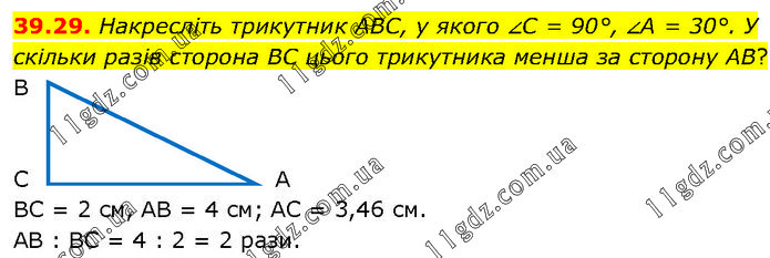 Накресліть трикутник ABC, у якого ∠C = 90°, ∠A = 30°. У скільки разів сторона BC цього трикутника менша за сторону AB? ВС = 2 см, АВ = 4 см; АС = 3,46 см. АВ : ВС = 4 : 2 = 2 рази.