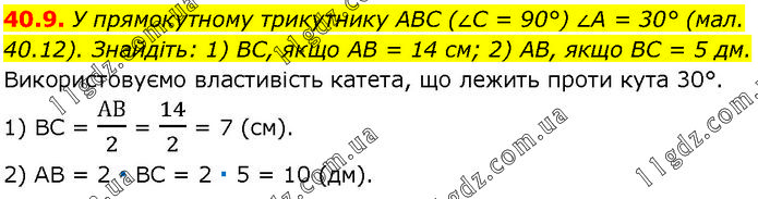 У прямокутному трикутнику ABC (∠C = 90°) ∠A = 30° (мал. 40.12). Знайдіть: 1) BC, якщо AB = 14 см; 2) AB, якщо BC = 5 дм. Використовуємо властивість катета, що лежить проти кута 30°. 1) ВС = АВ/2 = 14/2 = 7 (см). 2) АВ = 2 ∙ ВС = 2 ∙ 5 = 10 (дм).
