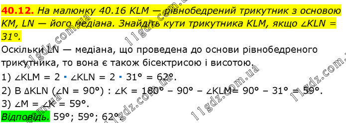 На малюнку 40.16 KLM — рівнобедрений трикутник з основою KM, LN — його медіана. Знайдіть кути трикутника KLM, якщо ∠KLN = 31°. Оскільки LN — медіана, що проведена до основи рівнобедреного трикутника, то вона є також бісектрисою і висотою. 1) ∠KLM = 2 ∙ ∠KLN = 2 ∙ 31° = 62°. 2) В ∆KLN (∠N = 90°) : ∠K = 180° – 90° – ∠KLM= 90° – 31° = 59°. 3) ∠M = ∠K = 59°. Відповідь. 59°; 59°; 62°.