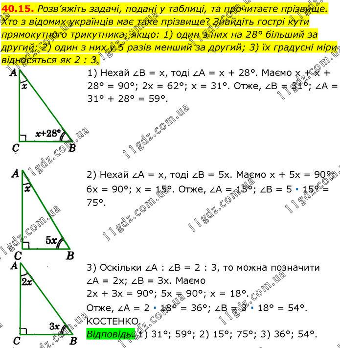 Розв’яжіть задачі, подані у таблиці, та прочитаєте прізвище. Хто з відомих українців має таке прізвище? Знайдіть гострі кути прямокутного трикутника, якщо: 1) один з них на 28° більший за другий; 2) один з них у 5 разів менший за другий; 3) їх градусні міри відносяться як 2 : 3. 1) Нехай ∠В = х, тоді ∠А = х + 28°. Маємо х + х + 28° = 90°; 2х = 62°; х = 31°. Отже, ∠В = 31°; ∠А = 31° + 28° = 59°. 2) Нехай ∠A = х, тоді ∠B = 5х. Маємо х + 5х = 90°; 6х = 90°; х = 15°. Отже, ∠A = 15°; ∠B = 5 ∙ 15° = 75°. 3) Оскільки ∠A : ∠B = 2 : 3, то можна позначити ∠A = 2х; ∠B = Зх. Маємо 2х + Зх = 90°; 5х = 90°; х = 18°. Отже, ∠A = 2 ∙ 18° = 36°; ∠B = 3 ∙ 18° = 54°. КОСТЕНКО. Відповідь. 1) 31°; 59°; 2) 15°; 75°; 3) 36°; 54°.