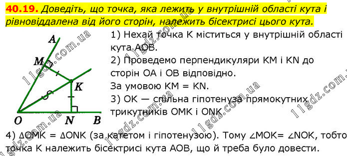 Доведіть, що точка, яка лежить у внутрішній області кута і рівновіддалена від його сторін, належить бісектрисі цього кута. 1) Нехай точка K міститься у внутрішній області кута AOB. 2) Проведемо перпендикуляри KM і KN до сторін OA і OB відповідно. За умовою KM = KN. 3) OK — спільна гіпотенуза прямокутних трикутників OMK і ONK. 4) ∆OMK = ∆ONK (за катетом і гіпотенузою). Тому ∠MOK= ∠NOK, тобто точка K належить бісектрисі кута AOB, що й треба було довести.