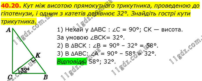 Кут між висотою прямокутного трикутника, проведеною до гіпотенузи, і одним з катетів дорівнює 32°. Знайдіть гострі кути трикутника. 1) Нехай у ∆АВС : ∠C = 90°; CK — висота. За умовою ∠BCK= 32°. 2) В ∆BCK : ∠B = 90° – 32° = 58°. 3) В ∆АВС: ∠A = 90° – 58° = 32°. Відповідь. 58°; 32°.