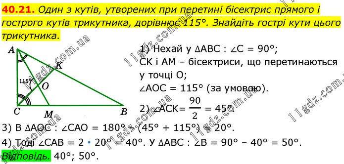 Один з кутів, утворених при перетині бісектрис прямого і гострого кутів трикутника, дорівнює 115°. Знайдіть гострі кути цього трикутника. 1) Нехай у ∆ABC : ∠C = 90°; CK і AM – бісектриси, що перетинаються у точці О; ∠AOC = 115° (за умовою). 2) ∠ACK= 90/2 = 45°. 3) В ∆AOC : ∠CAO = 180° – (45° + 115°) = 20°. 4) Тоді ∠CAB = 2 ∙ 20° = 40°. У ∆ABC : ∠B = 90° – 40° = 50°. Відповідь. 40°; 50°.