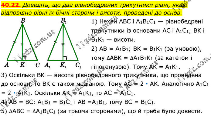 Доведіть, що два рівнобедреник трикутники рівні, якщо відповідно рівні їх бічні сторони і висоти, проведені до основ. 1) Нехай ABC і A1B1C1 — рівнобедрені трикутники із основами AC і A1C1; BK і B1K1 — висоти. 2) AB = A1B1; BK = B1K1 (за умовою), тому ∆ABK = ∆A1B1K1 (за катетом і гіпотенузою). Тому AK = A1K1. 3) Оскільки BK — висота рівнобедреного трикутника, що проведена до основи, то BK є також медіаною. Тому AC = 2 ∙ AK. Аналогічно A1C1 = 2 ∙ A1K1. Оскільки AK = A1K1, то AC = A1C1. 4) AB = BC; A1B1 = B1C1 і AB = A1B1, тому BC = B1C1. 5) ∆ABC = ∆A1B1C1 (за трьома сторонами), що й треба було довести.