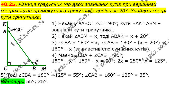 Різниця градусних мір двох зовнішніх кутів при вершинах гострих кутів прямокутного трикутника дорівнює 20°. Знайдіть гострі кути трикутника. 1) Нехай у ∆ABC i ∠C = 90°; кути BAK і ABM – зовнішні кути трикутника. 2) Нехай ∠ABM = х, тоді ABAK = х + 20°. 3) ∠CBA = 180° – х; ∠CAB = 180° – (х + 20°) = 160° – х (за властивістю суміжних кутів). 4) Маємо ∠CBA + ∠CAB = 90°; 180° – х + 160° – х = 90°; 2х = 250°; х = 125°. 5) Тоді ∠CBA = 180° – 125° = 55°; ∠CAB = 160° – 125° = 35°. Відповідь. 55°; 35°.
