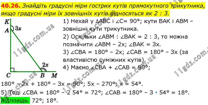 Знайдіть градусні міри гострих кутів прямокутного трикутника, якщо градусні міри їх зовнішніх кутів відносяться як 2 : 3. 1) Нехай у ∆ABC i ∠C= 90°; кути BAK і ABM – зовнішні кути трикутника. 2) Оскільки ∠ABM : ∠BAK = 2 : 3, то можна позначити ∠ABM – 2х; ∠BAK = Зх. 3) ∠CBA = 180° – 2х; ∠CAB = 180° – Зх (за властивістю суміжних кутів). 4) Маємо ∠CBA + ∠CAB = 90°; 180° – 2х + 180° – Зх = 90°; 5х – 270°; х = 54°. 5) Тоді ∠CBA = 180° – 2 54° = 72°; ∠CAB = 180° – З ∙ 54° = 18°. Відповідь. 72°; 18°.