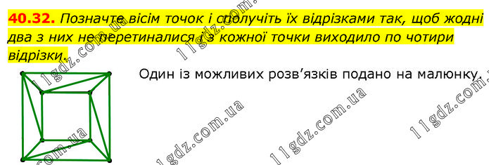 Позначте вісім точок і сполучіть їх відрізками так, щоб жодні два з них не перетиналися і з кожної точки виходило по чотири відрізки. Один із можливих розв’язків подано на малюнку.