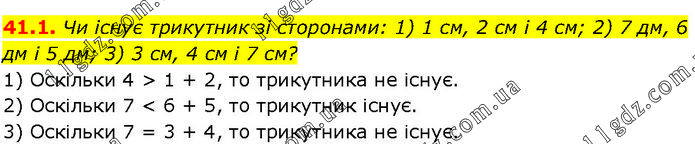 Чи існує трикутник зі сторонами: 1) 1 см, 2 см і 4 см; 2) 7 дм, 6 дм і 5 дм; 3) 3 см, 4 см і 7 см? 1) Оскільки 4 > 1 + 2, то трикутника не існує. 2) Оскільки 7 < 6 + 5, то трикутник існує. 3) Оскільки 7 = 3 + 4, то трикутника не існує.