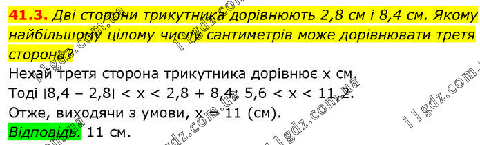Дві сторони трикутника дорівнюють 2,8 см і 8,4 см. Якому найбільшому цілому числу сантиметрів може дорівнювати третя сторона? Нехай третя сторона трикутника дорівнює х см. Тоді ∣8,4 – 2,8∣ < х < 2,8 + 8,4; 5,6 < х < 11,2. Отже, виходячи з умови, х = 11 (см). Відповідь. 11 см.