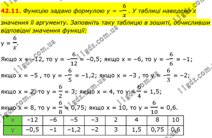 Функцію задано формулою у = –6/x . У таблиці наведено х значення її аргументу. Заповніть таку таблицю в зошиті, обчисливши відповідні значення функції: у = 6/x. Якщо х = –12, то у = –6/12 = –0,5; якщо x = –6, то у = –6/6 = –1; якщо x = –5 , то у = –6/5 = –1,2; якщо х = –3 , то у = –6/3 = –2; якщо х = 2, то у = 6/2 = 3; якщо x = 4, то у = 6/4 = 1,5; якщо х = 8, то у = 6/8 = 0,75; якщо х = 10, то у = 6/10 = 0,6.
