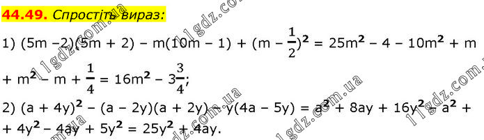 Спростіть вираз: 1) (5m –2)(5m + 2) – m(10m – 1) + (m – 1/2)2 = 25m2 – 4 – 10m2 + m + m2 – m + 1/4 = 16m2 – 33/4; 2) (a + 4y)2 – (a – 2y)(a + 2y) – y(4a – 5y) = a2 + 8ay + 16у2 – a2 + 4y2 – 4ay + 5y2 = 25y2 + 4ay.