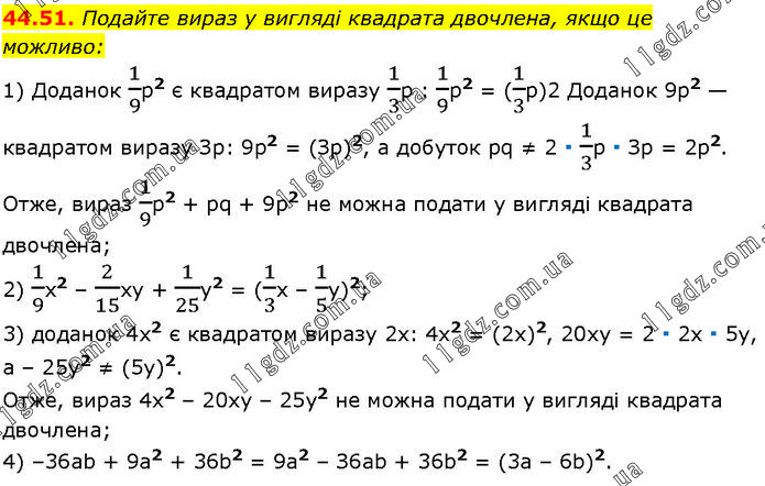 Подайте вираз у вигляді квадрата двочлена, якщо це можливо: 1) Доданок 1/9p2 є квадратом виразу 1/3p : 1/9p2 = (1/3p)2. Доданок 9р2 — квадратом виразу Зр: 9р2 = (Зр)2, а добуток pq ≠ 2 ∙ 1/3p ∙ Зр = 2р2. Отже, вираз 1/9p2 + pq + 9p2 не можна подати у вигляді квадрата двочлена; 2) 1/9x2 – 2/15xy + 1/25y2 = (1/3x – 1/5y)2; 3) доданок 4х2 є квадратом виразу 2х: 4х2 = (2х)2, 20ху = 2 ∙ 2х ∙ 5y, a – 25y2 ≠ (5y)2. Отже, вираз 4х2 – 20ху – 25у2 не можна подати у вигляді квадрата двочлена; 4) –36ab + 9a2 + 36b2 = 9а2 – З6аb + 36b2 = (3а – 6b)2.