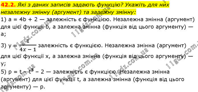 Які з даних записів задають функцію? Укажіть для них незалежну змінну (аргумент) та залежну змінну: 1) a = 4b + 2 — залежність є функцією. Незалежна змінна (аргумент) для цієї функції b, а залежна змінна (функція від цього аргументу) — а; 3) y = 1/(4x - 1) залежність є функцією. Незалежна змінна (аргумент) для цієї функції x, а залежна змінна (функція від цього аргументу) — у; 5) p = t – t3 – 2 — залежність є функцією. Незалежна змінна (аргумент) для цієї функції t, а залежна змінна (функція від цього аргументу) — р.