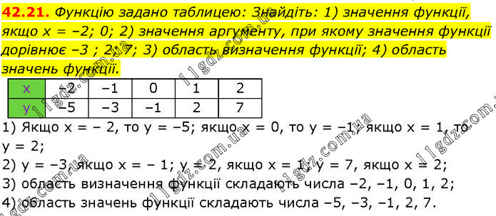 Функцію задано таблицею: Знайдіть: 1) значення функції, якщо х = –2; 0; 2) значення аргументу, при якому значення функції дорівнює –3 ; 2; 7; 3) область визначення функції; 4) область значень функції. 1) Якщо х = – 2, то у = –5; якщо х = 0, то у = –1; якщо х = 1, то у = 2; 2) у = –3, якщо х = – 1; у = 2, якщо х = 1; у = 7, якщо х = 2; 3) область визначення функції складають числа –2, –1, 0, 1, 2; 4) область значень функції складають числа –5, –3, –1, 2, 7.