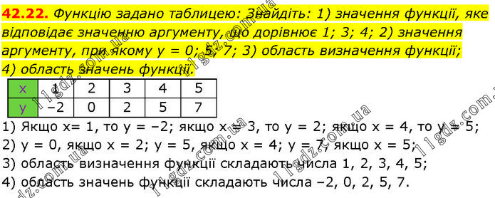 Функцію задано таблицею: Знайдіть: 1) значення функції, яке відповідає значенню аргументу, що дорівнює 1; 3; 4; 2) значення аргументу, при якому у = 0; 5; 7; 3) область визначення функції; 4) область значень функції. 1) Якщо х= 1, то у = –2; якщо х = 3, то у = 2; якщо х = 4, то у = 5; 2) у = 0, якщо х = 2; у = 5, якщо х = 4; у = 7, якщо х = 5; 3) область визначення функції складають числа 1, 2, 3, 4, 5; 4) область значень функції складають числа –2, 0, 2, 5, 7.