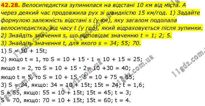 Велосипедистка зупинилася на відстані 10 км від міста. А через деякий час продовжила рух зі швидкістю 15 км/год. 1) Задайте формулою залежність відстані s (у км), яку загалом подолала велосипедистка, від часу t (у год), який відраховується після зупинки. 2) Знайдіть значення s, що відповідає значенню t = 1; 2; 5. 3) Знайдіть значення t, для якого s = 34; 55; 70. 1) S = 10 + 15t; 2) якщо t = 1, то S = 10 + 15 ∙ 1 = 10 + 15 = 25; якщо t = 2, то S = 10 + 15 ∙ 2= 10 +30 = 40; якщо t = 5, то S = 10 + 15 ∙ 5 = 10 + 75 = 85; 3) S = 34, якщо: 34 = 10 + 15t; 15t = 24; t = 1,6; S = 55, якщо: 55 = 10 + 15t; 15t = 45; t = 3; S = 70, якщо: 70 = 10 + 15t; 15t = 60; t = 4.