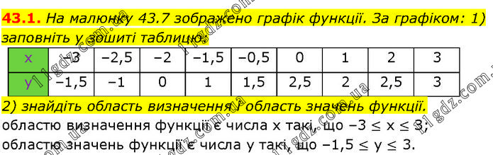 На малюнку 43.7 зображено графік функції. За графіком: 1) заповніть у зошиті таблицю: 2) знайдіть область визначення і область значень функції. областю визначення функції є числа х такі, що –3 ≤ х ≤ З; областю значень функції є числа у такі, що –1,5 ≤ у ≤ 3.