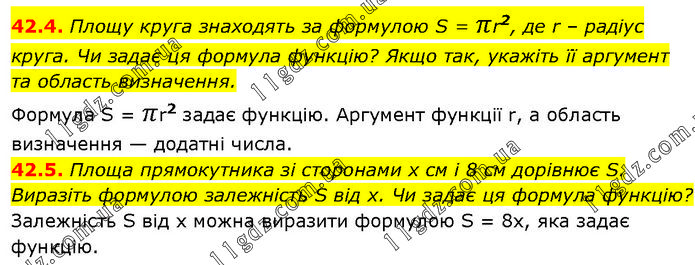 42.4. Площу круга знаходять за формулою S = πr2, де r – радіус круга. Чи задає ця формула функцію? Якщо так, укажіть її аргумент та область визначення. Формула S = πr2 задає функцію. Аргумент функції r, а область визначення — додатні числа. 42.5. Площа прямокутника зі сторонами х см і 8 см дорівнює S. Виразіть формулою залежність S від х. Чи задає ця формула функцію? Залежність S від x можна виразити формулою S = 8x, яка задає функцію.