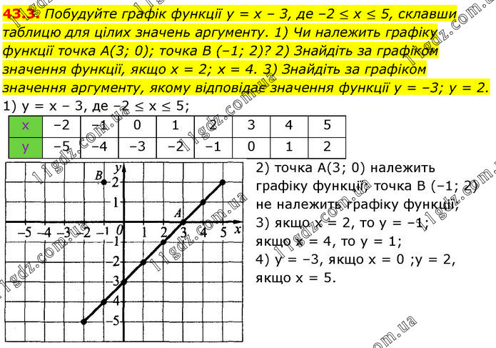 Побудуйте графік функції у = х – 3, де –2 ≤ х ≤ 5, склавши таблицю для цілих значень аргументу. 1) Чи належить графіку функції точка А(3; 0); точка В (–1; 2)? 2) Знайдіть за графіком значення функції, якщо х = 2; х = 4. 3) Знайдіть за графіком значення аргументу, якому відповідає значення функції у = –3; у = 2. 1) у = х – 3, де –2 ≤ х ≤ 5; 2) точка A(3; 0) належить графіку функції; точка B (–1; 2) не належить графіку функції; 3) якщо х = 2, то у = –1; якщо х = 4, то у = 1; 4) у = –3, якщо х = 0 ;у = 2, якщо х = 5.