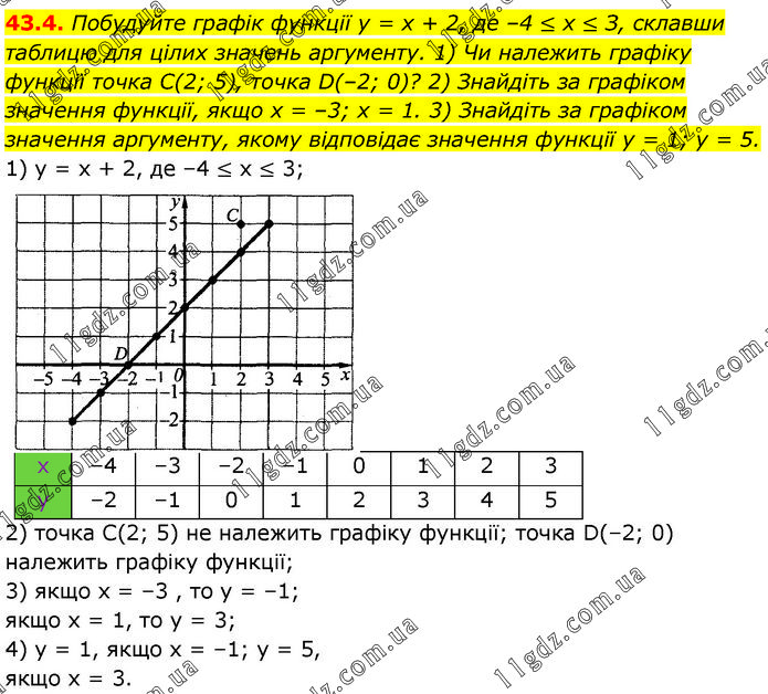 Побудуйте графік функції у = х + 2, де –4 ≤ х ≤ З, склавши таблицю для цілих значень аргументу. 1) Чи належить графіку функції точка С(2; 5), точка D(–2; 0)? 2) Знайдіть за графіком значення функції, якщо х = –3; х = 1. 3) Знайдіть за графіком значення аргументу, якому відповідає значення функції у = 1; у = 5. 1) y = x + 2, де –4 ≤ х ≤ 3; 2) точка С(2; 5) не належить графіку функції; точка D(–2; 0) належить графіку функції; 3) якщо х = –3 , то у = –1; якщо х = 1, то y = 3; 4) y = 1, якщо x = –1; y = 5, якщо x = 3.
